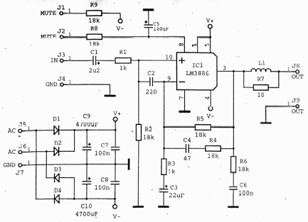 V zapojení je použit IO LM3886 v doporučeném zapojení. Symetrické napájecí napětí je (podle požadovaného výkonu) až ±35V. Pro určitou rezervu je dobré v napájecí části použít kondenzátory C9 a C10 na 50V.